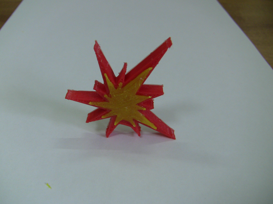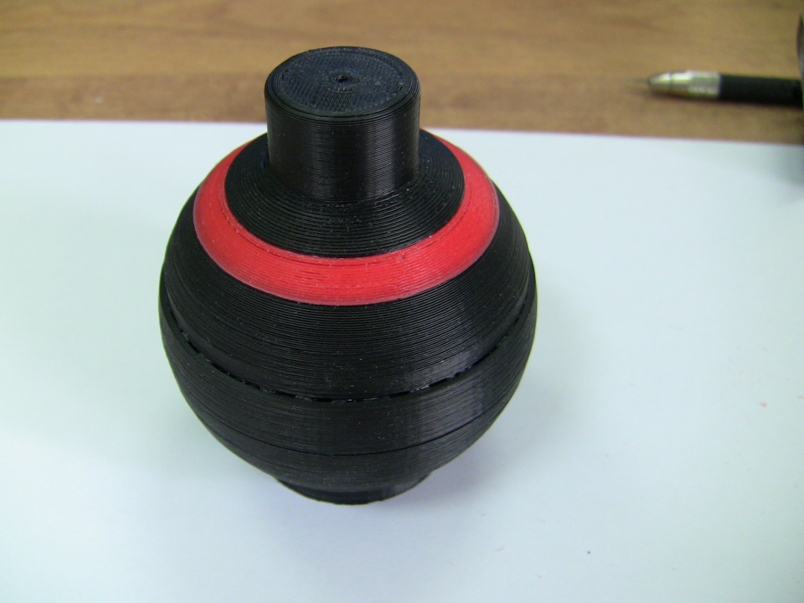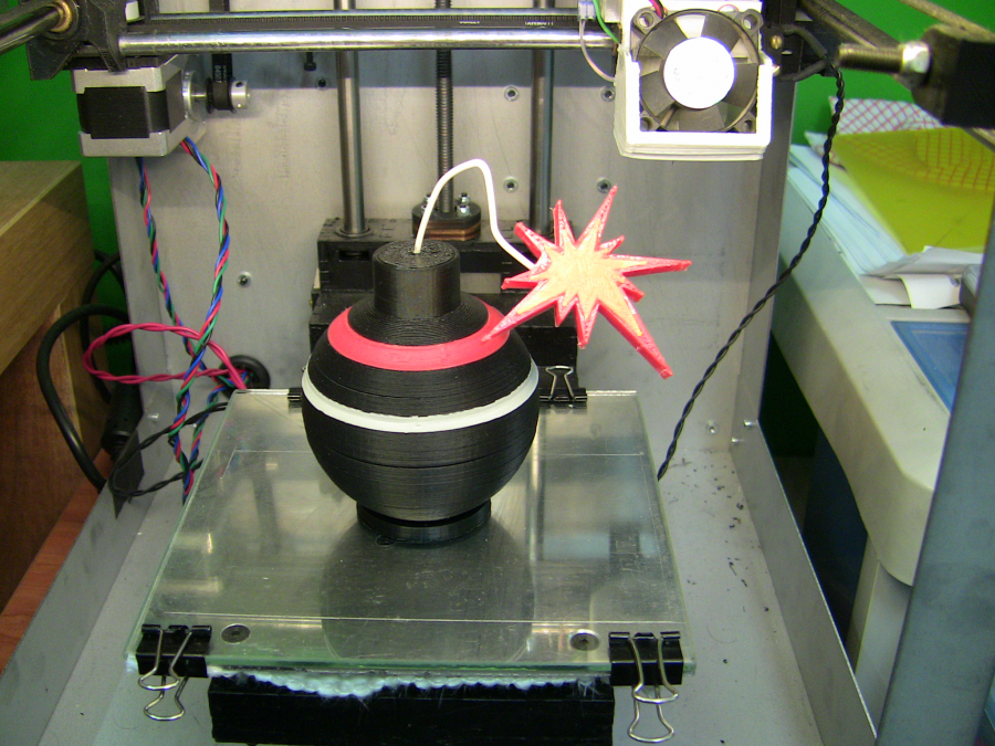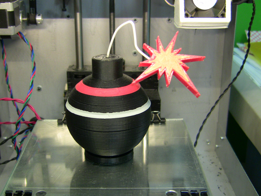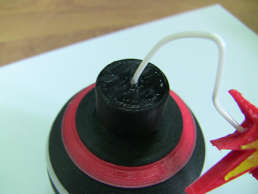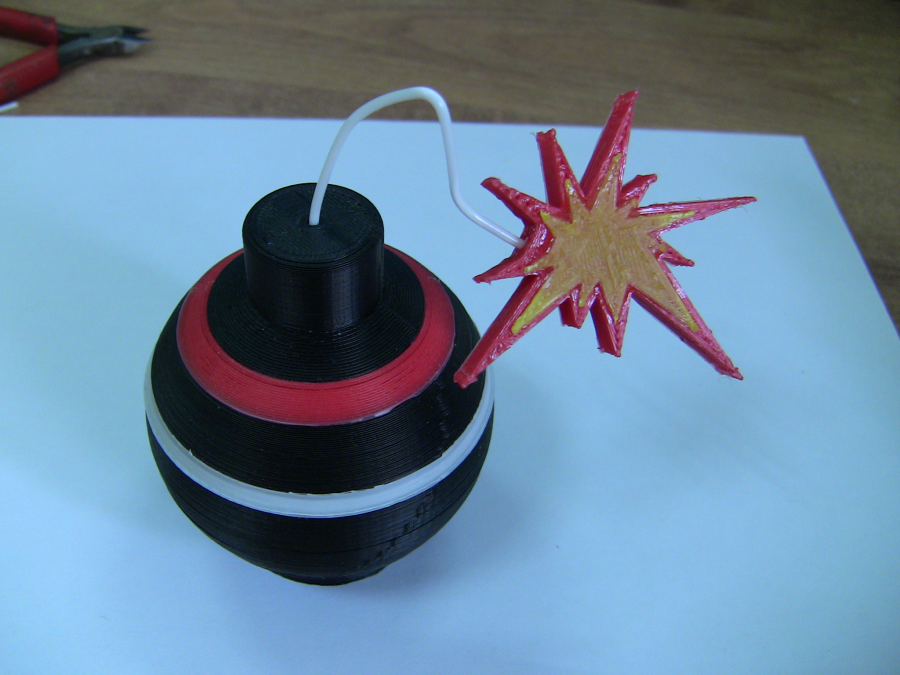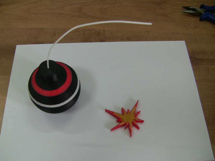 So I think that we should to print a red line instead. Assemble the rings: Gluing the spark with acetone: Using some filament as the fuse and gluing it with acetone to the spark and the bomb. Warming up a little the filament and shaping it. The result: |